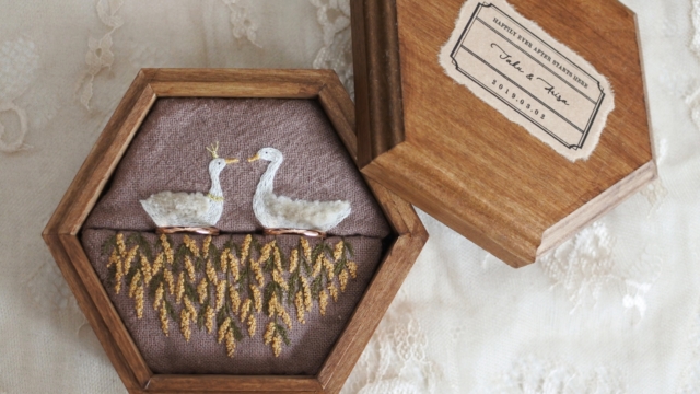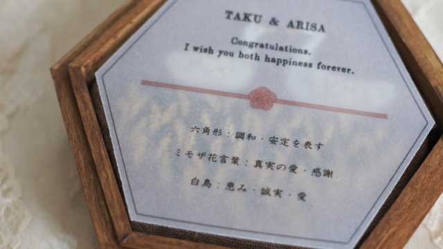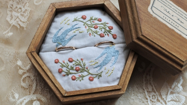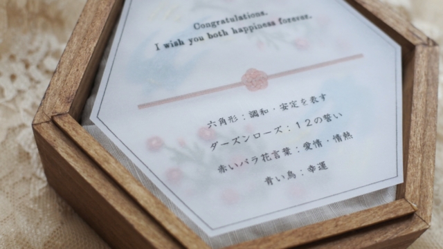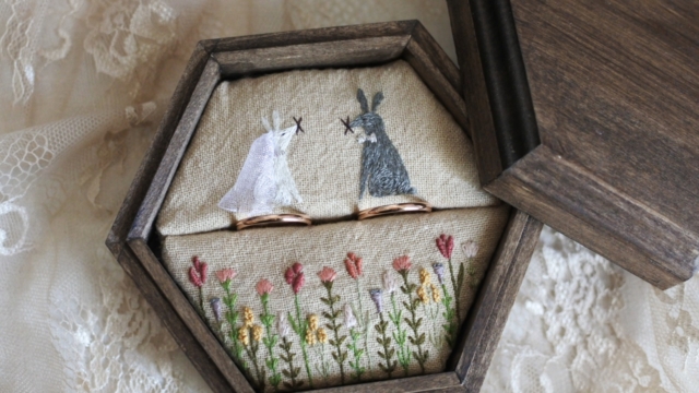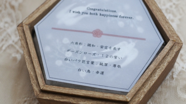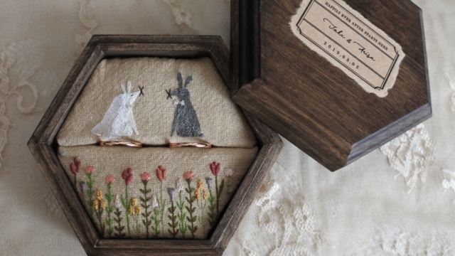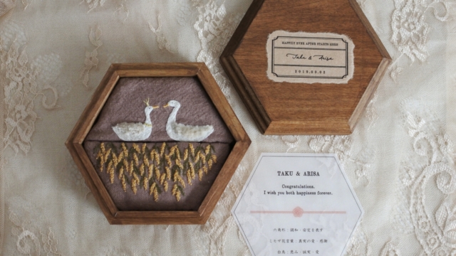 図案だけでなく、六角形の木箱に指輪を挟むタイプのデザインも前例がない中考えたものですので、似たものを作られるととても悲しいです。