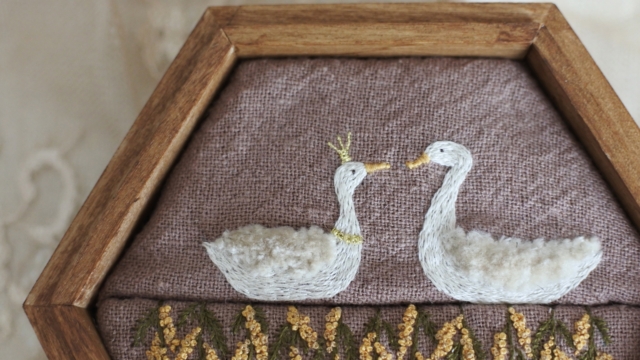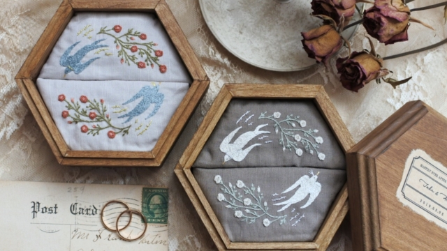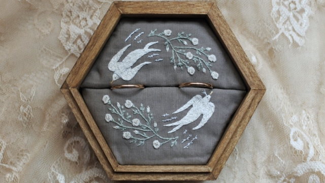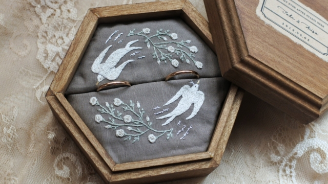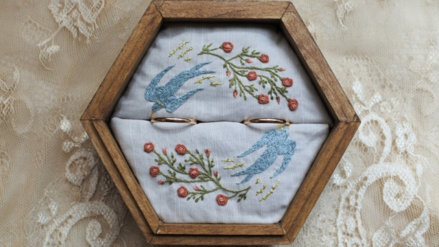 ご自身でリングピローを作ってみたい・プレゼントをしてみたいという方は、日本ヴォーグ社出版のアリノコ舎の刺繍図案帖に作り方と図案2点を掲載しているので、そちらもご検討ください。