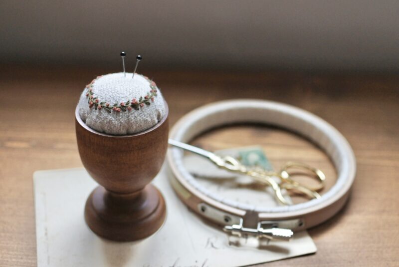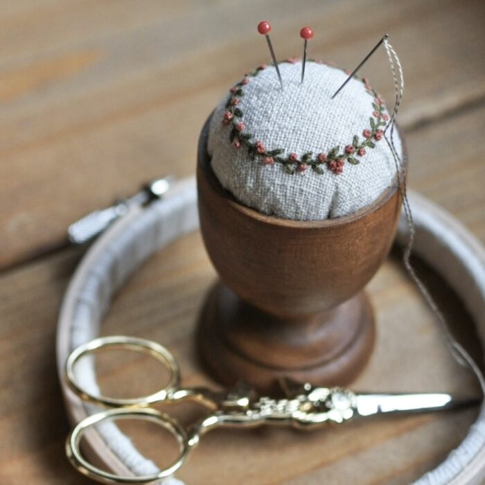 ちいさな赤い実がたくさん付いたリースを刺繍して、前回のレッスンでも好評だった木製のピンクッションに仕立てていただく内容です。